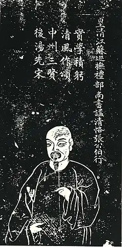 Their famously heated conflict eventually led to the establishment of a commission charged with investigating the accusations they made against each other.[1][2] Although Zhang was sentenced to death by the Ministry of Justice, his honest character convinced the emperor to dismiss the unfavourable reports made against him.[4][1] While both Gali and Zhang were officially dismissed, the latter was allowed to remain at his post.[3] In 1715, Zhang was summoned to Beijing. The emperor appointed him to the Imperial Study and also made him acting superintendent of government granaries.[1] In 1720, Zhang was made vice-president of the Board of Revenue, which he served concurrently with his role as superintendent of granaries. He was made Minister of Rites by the Yongzheng Emperor in 1723. He died in 1725 and was honoured with the posthumous name Qīngkè (淸恪) and the title of Grand Guardian of the Heir Apparent.[1] In 1878, Zhang was further honoured with his name's inclusion in the Temple of Confucius.