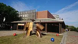 The center was designed by Kuo Jun-pei Architectural Firm with Hakka architectural style forming a circular house.[3] The center spans over an area of 0.8 hectare and consists of two floors. The ground floor is used for normal activities and the upper floor is used for specific activities. Dynamic activities are held at the atrium and outdoor plaza. It was constructed with a total cost of almost NT$100 million.[2]