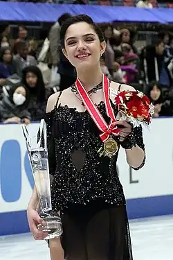 Evgenia Armanovna Medvedeva (alt. spelling: Yevgenia Medvedeva;[1] Russian: Евгения Армановна Медведева, IPA: [jɪvˈɡʲenʲɪjə mʲɪˈdvʲedʲɪvə]; born 19 November 1999), is a retired competitive Russian figure skater. She is the 2018 PyeongChang Olympic silver medalist (2018 women's singles, 2018 team event), a two-time world champion (2016, 2017), a two-time European champion (2016, 2017), a two-time Grand Prix Final champion (2015, 2016), a two-time Russian national champion (2016, 2017), silver medalist at the 2018 European Figure Skating Championships and bronze medalist at the 2019 World Championships. Earlier in her career, she won the 2015 World Junior Championships, the 2014 Junior Grand Prix Final, and the 2015 Russian Junior Championships.[2]