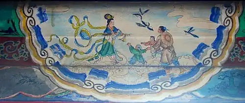 Zhinü was the seventh daughter of the Jade Emperor. One day she came down to Earth and, while bathing in a river, met Niulang, a cowherd. Niulang was so amazed by her beauty that he instantly fell in love with her and stole her clothes.[4] Without her clothes, Zhinü was unable to return to heaven. Instead, she decided to marry Niulang. Niulang farmed in the fields while Zhinü weaved at home and took care of their children. Zhinü was so deeply in love and for so long that she no longer desired a return to heaven. However, their relationship was discovered by her father, Jade Emperor, who ordered the Queen Mother of the West to bring Zhinü back to Heaven. Niulang was very upset when he found out his wife had been taken back to heaven. Niulang's ox, who saw the events unfold, built a boat for him to carry his children up to Heaven. The ox was once the god of cattle but was punished after he had violated the laws of Heaven.