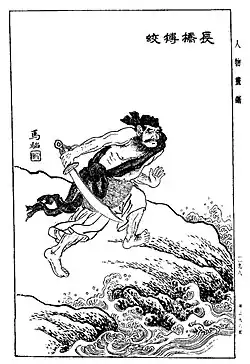 Prompted by a villager, Zhou Chu took on the challenge to seek out and kill the tiger and the scaly dragon that lived in a stream (the jiao).[a] His battle with this dragon endured for 3 days in Lake Tai, and the villagers were celebrating the demise of the two scourges when Zhou Chu returned triumphant with the dragon's head. That was when he realized that he was the last scourge that the villagers feared. Determined to mend his old ways, he sought out Eastern Wu generals Lu Ji and Lu Yun (陸雲), and received encouragement. Eventually he became an accomplished general beloved by his people.[3][5][4]