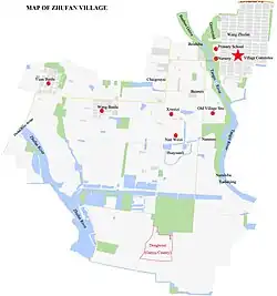 The village is located in the low flat plain, bounded between the Zhufan and Tangzi rivers.