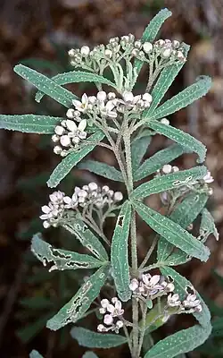 Masses of white flowers about 6–7 mm (0.2–0.3 in) in diameter are arranged in clusters of between 10 and 16 but sometimes as many as 28, in leaf axils. The clusters have a hairy, warty stalk 4–10 mm (0.2–0.4 in) long and are usually longer than the leaves. There are one or two bracts at the base of the cluster. The sepals are triangular, less than 1 mm (0.04 in) long and covered with velvety hairs. The four petals are egg-shaped, about 4 mm (0.2 in) long, 2 mm (0.08 in) wide, densely hairy on the lower side and sparsely hairy on top. The four stamens are tipped with an orange-red anther. Flowering occurs mainly in September and is followed by fruit which is a more or less glabrous capsule.[2][3][4]