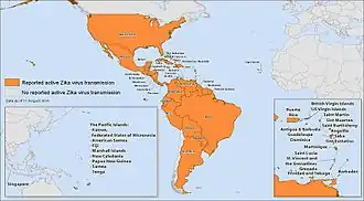 The virus that causes the disease was first isolated in Africa in 1947.[12] The first documented outbreak among people occurred in 2007 in the Federated States of Micronesia.[2] An outbreak started in Brazil in 2015, and spread to the Americas, Pacific, Asia, and Africa.[13] This led the World Health Organization to declare it a Public Health Emergency of International Concern in February 2016.[13] The emergency was lifted in November 2016, but 84 countries still reported cases as of March 2017.[14] The last proven case of Zika spread in the Continental United States was in 2017.[15]