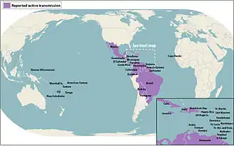 By using phylogenetic analysis of Asian strains, it was estimated that Zika virus had moved to Southeast Asia by 1945.[47] In 1977–1978, Zika virus infection was described as a cause of fever in Indonesia.[103] Before 2007, there were only 13 reported natural infections with Zika virus, all with a mild, self-limited febrile illness.[33][104] As of July 2019, evidence of local transmission from mosquitoes to humans has been reported in a total of 87 countries from four of six WHO Regions; African, Americas, South-East Asia and Western Pacific.[105]