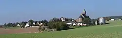 The German blazon reads: Ein silbernes Schildhaupt, darin ein durchgehendes rotes Kreuz belegt mit einer goldenen Lilie, gespalten in Grün, vorne ein silberner Grabhügel mit Urne, hinten eine goldene Ährengarbe.