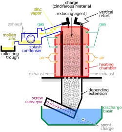 This process begins by roasting concentrates that are mixed with coal and briquetted in two stages. The briquettes are then heated in an autogenous coker at 700 °C (1,292 °F) and then charged into the retort. There are three reasons to briquette the calcine: to ensure free downward movement of the charge; to permit heat transfer across a practical size cross-section; to allow adequate porosity for the passage of reduced zinc vapour to the top of the retort. The reduced zinc vapour that is collected at the top of the retort is then condensed to a liquid.[7]