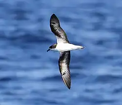 This long-winged petrel is 32–34 cm (13–13 in) long with an 80–86 cm (31–34 in) wingspan,[13] and an average weight of 290 g (10.3 in).[14] It has a grey back, grey wings with a dark "W" marking across them, and a grey upper tail. The undersides of the wings are blackish, apart from a triangle of white at the front edge near the body, and the belly is white with grey flanks. The head has a mottled whitish-brown forehead, a dark cap, and a dark spot below and behind the brown eye. The bill is black and the legs are flesh pink, the colour continuing onto the first third of the feet, the rest of the toes and webs being black-brown.[15] It gives the general impression of a small Cory's or great shearwater, with a fast flight; in strong winds it shears high above the surface with angled wings.[13] Nothing is known of the fresh juvenile plumage or the moult sequence, and age assessment is currently not feasible.[14]