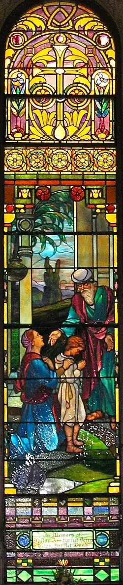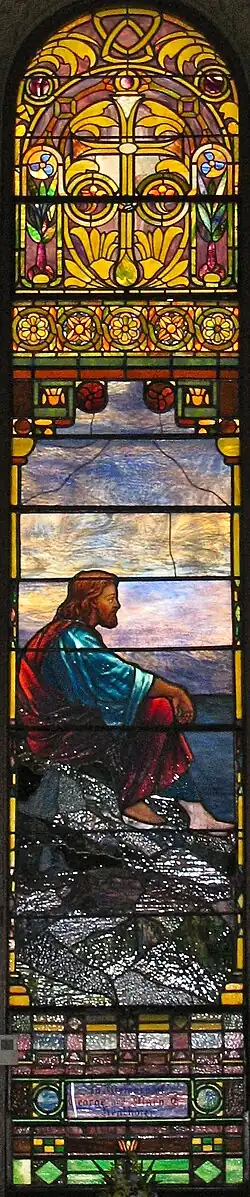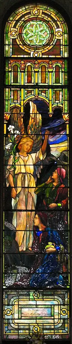 Most striking to those who visit Zion Church are the stained glass windows. The oldest windows are the Roman Window and the Schnebly Window which were installed between 1880 and 1907. When the church was remodeled in 1908, nine more stained glass windows were installed and since that time more have been added for a total of ten in the sanctuary, two in the narthex, two angel windows in the vestibule, two in the foyer, and four more in the chapel. Wikimedia Commons has photographs of all of the church's stained glass windows.