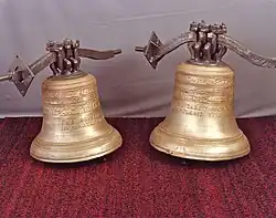 The bells, so ordered, were shipped across the Atlantic and hauled over the mountain to their destination in the tower of the church.[3] The two bells hanging today in the tower were cast in 1785 in Rotterdam, Holland, in the foundry of G. Bakker. From information provided in 1920 by the same company, the composition of the metal in these bells has been determined to be eleven per cent coin silver for tonal clarity with proportionate amounts of antimony, bismuth, copper, tin, and zinc. These bells have a tone peculiarly their own.[3]