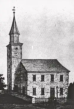 The 18th century western frontier of the Maryland colony had previously been ravaged by marauding Shawnee and Delaware Indians after General Edward Braddock’s defeat at Fort Duquesne. In spite of the danger, German settlers erected a log schoolhouse around 1766 on the grounds of the present church, an area then known as Potato Hill. This building was used by the German community both as a school and as a place for religious services. Local Indians would listen to the lessons through the windows.[4] The Tuscarora Indians were the last native people known to inhabit the area in large numbers. The log school building was used for services until the stone church was built, then it continued to serve as a day school and as a lecture hall.[4]