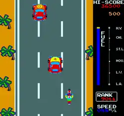 When the player reaches NY, a sign saying "Viva NY" is shown while the Statue of Liberty waves its hand and "The Star-Spangled Banner" is played. After this, the game restarts with the player's score intact but the difficulty increases and the player has a higher capacity motorcycle (with correspondingly faster top speed).[8]
