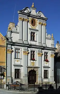 There are three churches in Zlaté Hory and several smaller sacral monuments.[17] In the town centre are located the Church of the Assumption of the Virgin Mary and the Church of the Holy Cross. The pilgrimage Church of Mary Help of Christians is situated in the hills south from the town. The Church of the Assumption of the Virgin Mary is the landmark of the town. The originally early Gothic structure was rebuilt to its current Baroque form after a fire in 1699.[18] The Baroque Church of the Holy Cross dates from 1764–1768. Today its chamber environment serves mainly cultural purposes.[19]