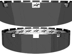 A "Great Zoetrope; or: Wheel of Life", 50 feet (15 meters) in circumference, with "life-size figures", was installed in the Concert Hall of the Crystal Palace in London by permission of the London Stereoscopic and Photographic Company. The programme featured at least four animations based on strips in their catalogue. The huge cylinder was turned around by a gas engine and was operative at least from late 1867 to spring 1868.[45]