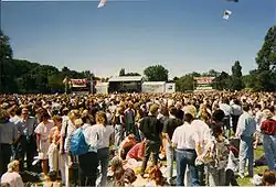 During the tour, they covered parts of the Milli Vanilli songs "Girl I'm Gonna Miss You" and "Baby Don't Forget My Number".[18][19] Faith No More had earlier met Milli Vanilli at the album launch party for The Real Thing in mid-1989. Faith No More greeted Milli Vanilli at the launch party and told them that they were fans, but Milli Vanilli were unaware of who Faith No More were at that time.[20] Other songs that Faith No More covered snippets from during the tour include "Buffalo Stance" by Neneh Cherry, "Bust a Move" by Young MC, "Don't Dream It's Over" by Crowded House, "Don't Let the Sun Go Down on Me" by Elton John, "Get Up! (Before the Night Is Over)" by Technotronic, "Fever" by Peggy Lee, "Für Elise" by Ludwig van Beethoven, "If You Don't Know Me by Now" by Simply Red, "It Takes Two" by Rob Base & DJ E-Z Rock, "Let Love Rule" by Lenny Kravitz, "Louie Louie" by The Kingsmen, "Macho Man" by The Village People, "Oh Yeah" by Yello, "Paradise" by Sade, "Philadelphia Freedom" by Elton John, "Pump up the Jam" by Technotronic, "Pump up the Volume" by M|A|R|R|S, "Sunday Bloody Sunday" by U2, "Turtle Power!" by Partners in Kryme, "Unskinny Bop" by Poison, "Vogue" by Madonna, "Y.M.C.A." by The Village People, "You Got It (The Right Stuff)" by The New Kids on the Block and the theme from the film Love Story by Francis Lai.[21][22][23][24] They covered a snippet of "Carnaval in Rio" by Heino, but changed the lyrics to "Carnaval in Cologne" when playing it in Cologne, Germany, and to "Carnaval in Munich" when playing it in Munich, Germany.[24][25] They also covered a song from a German candy commercial, which was by confectionery company Haribo, as well as a song called "Sweet Dreams" from a Nestlé commercial, with the band continuing to cover these two songs on the tour for Angel Dust.[23][26] For outro music at their shows, the band once used "What a Wonderful World" by Louis Armstrong, while for intro music they frequently used Toto's Dune soundtrack song "Big Battle"[27][28]