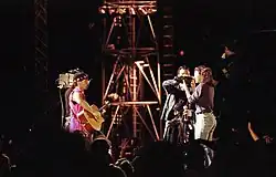 "Mysterious Ways" featured a belly dancer on-stage, tempting Bono and dancing just out of his reach.[100] Initially, Floridian fan Christina Petro filled the role. After appearing outside the venue of the band's final dress rehearsal in a belly-dancing outfit, the crew invited her inside to dance with Bono to lighten the mood. The group liked their interaction and that it made reference to the belly dancer in the song's music video, and she accepted an invitation to join the tour.[30][87] For the "Outside Broadcast" leg, tour choreographer Morleigh Steinberg took over the role.[101][102] Performances of "One" were accompanied by the title word shown in many languages, as well as Mark Pellington-directed video clips of buffalos culminating with David Wojnarowicz's "Falling Buffalo" photograph.[98] For "Until the End of the World", Bono often played with a camera, kissing the lens and thrusting it into his crotch, a stark contrast from his more earnest stage behaviour of the past.[3] Beginning with "Outside Broadcast", the band began playing "New Year's Day" afterwards.[103] During "Tryin' to Throw Your Arms Around the World", Bono danced with a young female fan from the crowd (a ritual he had done more solemnly on past tours), shared camcorder video filming duties with her, and sprayed champagne.[104] At this point in the show, Mullen sometimes sang a solo performance of "Dirty Old Town".[105]