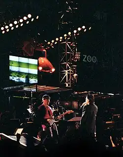The juxtaposition of such disparate programming inspired U2 and Achtung Baby co-producer Brian Eno to conceive an "audio-visual show" that would display a rapidly changing mix of live and pre-recorded video on monitors.[11][13] The idea was intended to mock the desensitising effect of mass media.[4] Eno, who was credited in the tour programme for the "Video Staging Concept",[16] explained his vision for the tour: "the idea to make a stage set with a lot of different video sources was mine, to make a chaos of uncoordinated material happening together ... The idea of getting away from video being a way of helping people to see the band more easily ... this is video as a way of obscuring them, losing them sometimes in just a network of material."[17]