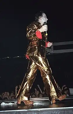 MacPhisto was created to parody the devil and was named after Mephistopheles of the Faust legend.[136] Initially called "Mr. Gold", MacPhisto wore a gold lamé suit with gold platform shoes, pale makeup, lipstick, and devil's horns on his head.[137] As MacPhisto, Bono spoke with an exaggerated upper-class English accent, similar to that of a down-on-his-luck character actor.[136] The character was created as a European replacement for the American-influenced Mirror Ball Man.[51][136] The initial inspiration for MacPhisto came from a character in the stage musical The Black Rider, a performance of which Bono and the Edge attended in January 1993.[138] The MacPhisto character was realised during rehearsal the night before U2's first 1993 show.[139] According to Bono, "We came up with a sort of old English Devil, a pop star long past his prime returning regularly from sessions on The Strip in Vegas and regaling anyone who would listen to him at cocktail hour with stories from the good old, bad old days."[140] MacPhisto sang the closing "Can't Help Falling in Love" in an oddly childlike manner that many reviewers found one of the most poignant moments of the show.[141]
