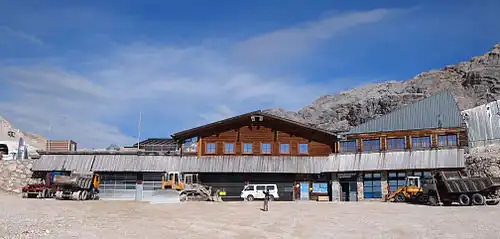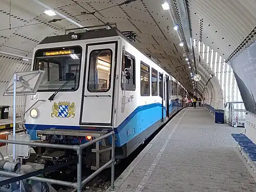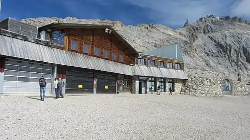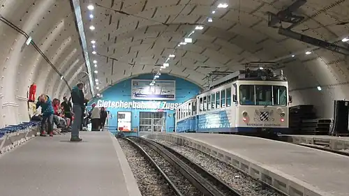 Zugspitzplatt Station, also known as the Glacier Station Zugspitzplatt, is a high-altitude railway terminus of the Bayerische Zugspitzbahn, a cog railway that connects Garmisch-Partenkirchen to the Zugspitzplatt, a plateau on Zugspitze, Germany's highest mountain at 2,962 meters (9,718 ft). Situated at approximately 2,588 meters (8,491 ft) above sea level, the station serves as a critical interchange point for the Gletscherbahn cable car, which transports passengers to the summit in about five minutes. The station is a key hub for tourists visiting the Zugspitze, particularly during winter when the surrounding area becomes Germany's highest ski resort.