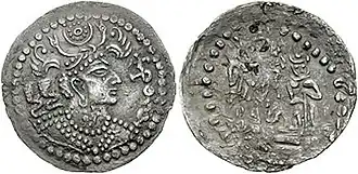 The relationship between the two relatives was at times antagonistic, but they fought together against Arab incursions.[5] Rubtil issued coins derived from Sassanian prototypes, with a Bactrian script legend on the obverse, a Pahlavi script legend on the reverse, and a short Brahmi script legend in the name of Śrī Vākhudevaḥ ("His Highness the Majestic Lord"):