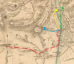 Wood completed his fortification of Fort Tinta on 21 January and determined to lead a stronger force to Zungwini.[11][9] Leaving only two companies of regular infantry (one each from the 13th and 90th) to guard the fort he set out at midnight on 21 January.[12][9] The horse were again led by Buller, while Wood led the advance with the 90th Regiment and his Irregulars. The 13th Regiment made up the rearguard.[13] Buller's force, with two artillery pieces, went to the western portion of the Zungwini Mountain range, Wood with the 90th and the Irregulars went to a point 3 miles (4.8 km) east of Buller in the middle of the range and the remaining forces, under Colonel Gilbert of the 13th Regiment, occupied a point to the south-east of the mountain.[9]