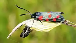 The wingspan of Zygaena transalpina can reach about 29–35 millimetres (1.1–1.4 in).[5] The forewings are of a shining bluish-green, or of a blue-black, with three pairs of carmine-red spots for each wing (in some individuals of both sexes, the spots are only five ). The two spots on the base are oval. The hind wings are carmine red, with a black-blue border and a slightly darker fringe. The underside of the forewings is light black-blue, usually with the same spots as the top.