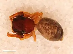 Length, 4.1 mm.; ceph.,1.8 mm. long, 1.4 mm. wide. Eye-region black, thoracic part reddish, both with whitish hairs and scales. Anterior femora black, black stripe above and on inner side of patella and tibia I., rest of legs pale yellowish, without any spots. Mandibles and mouth parts red-brown; sternum black. Abdomen black, clothed above and on sides with iridescent scales and long hairs; venter black, hairy, and with two indistinct rows of pale spots. Structure in general similar to Z. bettini, but the mandibles are not quite so large; and the sternum is much broader, not narrowed in front, so that the anterior coxae, which are not as long as in Z. bettini, are more widely separated. The region of the epigynum is red-brown, and is semicircular in outline; showing four pale spots, two in front close together, and one in each posterior corner. Franconia, N. H. (Mrs. Annie T. Slosson).