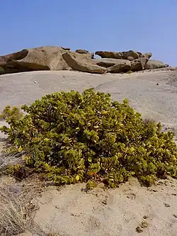 It grows in the Namib ecoregion along the Atlantic Ocean coast. Most of this plant's moisture comes from the morning mist. The shrub's round, coin-like leaves lend it its colloquial name: daalder is an old Dutch coin worth one and a half guilders.[4]