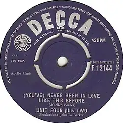 Decca Records released "(You've) Never Been in Love Like This Before" as Unit Four Plus Two's fourth single on 7 May 1965.[2][nb 2] The B-side, "Tell Somebody You Know", another composition written by Moeller and Parker, was a "straightforward rocker" compared to the A-side.[15] The single was part of a promotion campaign of the band by Decca, who simultaneously with the single also issued an EP. The EP was followed shortly after by the band's debut album, 1st Album, in June of that year.[16] The song was issued almost five months after "Concrete and Clay"; Tracy notes the long gap in between singles, during an era where a band was expected to issue singles within two month intervals.[15] As "Concrete and Clay" was still in the charts in the US during May 1965, the band's US label London Records postponed the release until July 1965.[7][nb 3] Unit Four Plus Two appeared on various light entertainment programmes in the UK, including Thank Your Lucky Stars on 22 May 1965, in order to promote the single's release.[15]
