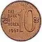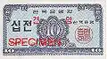 | | ₩10 | 22.86 mm | 4.22 g | Commercial bronze 88% copper 12% zinc | Plain | Dabotap Pagoda, value, bank title (hangul) | Value (digit), bank title, year of minting | 1966 | August 16, 1966 | Still circulating | Series I (가) |