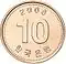 | ₩10 | 18 mm | 1.22 g | Copper-plated aluminium 48% copper 52% aluminium | Plain | Dabotap pagoda, value (hangul) | Value (digit), bank title, year of minting | 2006 | December 18, 2006 | Series IV (라) | ||