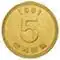 | | ₩5 | 20.4 mm | 2.95 g | High brass 65% copper 35% zinc | Plain | Geobukseon, value, bank title (hangul) | Value (digit), bank title, year of minting | 1970 | July 16, 1970 | 1992 | Series II (나) |