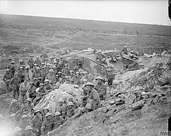 The Allies had launched their counter-offensive further south with the Battle of Amiens on 8 August. On the evening of 30 August the Germans were seen to be shelling their own line in front of 41st Division, and 10th Queen's received information that the enemy on the right had withdrawn. It sent forward strong patrols, who found that those in its front had also retired. By early morning on 31 August the patrols had pushed past Kemmel Hill without meeting any resistance, and the whole battalion advanced, with HQ situated at 'Donegal Farm'. Another division then took up the pursuit, and 10th Queen's went to Dickebusch for rest and training.[20][88]