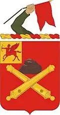 - Shield: Gules, a rock Proper resting on two cannons in saltire Or. On a canton of the last a winged centaur courant holding a bent bow and arrow of the field (for the 6th Field Artillery). And for unofficial use pendant to escutcheon a French Croix de Guerre with gilt star Proper.