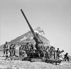 On the outbreak of war in September 1939 there had only been two batteries (bty) (9 and 19 AA Btys) manning the totally inadequate AA defences of Gibraltar, which consisted of four old QF 3-inch heavy AA guns and four new QF 3.7-inch heavy AA guns, split in two-gun sections to give the widest possible coverage, and two of the new Bofors 40mm light AA guns to protect the Royal Navy Dockyard, with the assistance of Royal Navy (RN) 2-pounder pom-pom guns. 10th AA Rgt was formed in December 1939 to command 9 and 19 AA Btys and train the anti-aircraft section of the new Gibraltar Defence Force (GDF), which took over the 3-inch guns. Apart from occasional shots fired at unidentified aircraft penetrating Gibraltar's airspace, there were no attacks on the fortress during the 'Phoney War' period.[1][2][3][4][5]