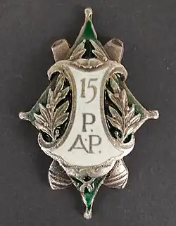 The badge, measuring 57x38 mm, is diamond-shaped, covered in dark green enamel against a backdrop of crossed artillery barrels of a silvery color.[38] In the center, on a decorative cartouche of patinated silver framed by laurel branches, the number and initials 15 PAP (15th Field Artillery Regiment) were inscribed. The badge was two-piece – for officers, made of silver or gilded tombac and enamelled.[38] It was designed by Wiktor Gontarczyk from Warsaw.[2] In 1939, the initials were changed from PAP to PAL.[38]
