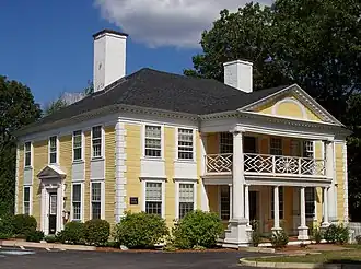 The structure stands two stories tall beneath a hip roof, seven bays wide and four bays deep. It is of frame construction covered with clapboard, except at the front where it is imitation ashlar; wood quoins ornament its corners. A two tier Doric porch projects from the front facade, with single-story Tuscan pillars supporting the porch, and two-story Doric pillars at the corners. The upper level has a balustrade with Chinese railings. The two sides and rear also contain entrances, and the rear facade was once graced with a large Palladian window. (As of 2005, the rear facade seems to have been obliterated in a large-scale extension to the building.) There are two interior end chimneys.