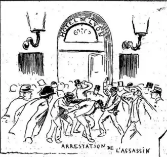 Between 1892 and 1894, during a series of events called the Ère des attentats, one of the Italian anarchist companions, Sante Caserio, assassinated the President of the French Republic, Sadi Carnot, in response to the repression of January and February 1894 and the execution of anarchists like Ravachol, Auguste Vaillant, and Émile Henry.[5][6][7] This assassination of the President in Lyon then served as a trigger for ethnic violence targeting Italians in the city and the region.[8][9]