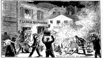 The next day, however, was marked by significantly more widespread violence targeting Italians.[8] From midday onwards, several businesses were attacked, and the assaults spread across the entire Lyon metropolitan area.[8] Throughout the day, destruction and looting followed one after another: the Casati bar at the Universal Exhibition was attacked and devastated by a hundred cafe waiters, and the Casartelli bird shop on Quai de l'Hôpital was also ransacked.[8]