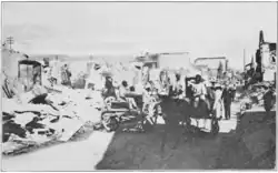 The greatest damage occurred at Kingston and at Buff Bay and Annotto Bay on the northern coast. Eighty-five percent of buildings in Kingston were destroyed by the shaking, which was followed by a fire that destroyed parts of the business and warehouse districts.[4] The Elder-Dempster passenger steamer Port Kingston, which was under repair in Kingston Harbour at the time, was threatened by fire on the nearby wharf. A rapid temporary repair allowed her to be moved to the safety of an unaffected railway wharf.[5] A suspension bridge was destroyed at Port Maria.[1]