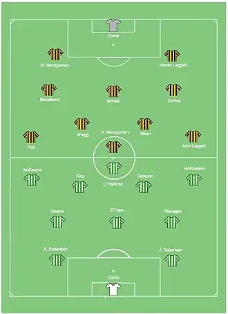 | | | GK | | J. Gavin | | FB | | James Robertson | | FB | | Andrew Robertson | | HB | | D. Flanagan | | HB | | Frank O'Hare (c) | | HB | | R. Owens | | LW | | D. McPherson | | LW | | T. Campion | | C | | R. O'Halloran | | RW | | M. King | | RW | | L. McKenzie | | Manager: | | McCamphill | | | | | | | | GK | | Dowie | | FB | | W. Montgomery | | FB | | James Leggatt (c) | | HB | | Broadbent | | HB | | McNeil | | HB | | Dunlop | | LW | | Piell | | LW | | Wregg | | C | | A. Montgomery | | RW | | Aitken | | RW | | John Leggatt | | | | | | | |