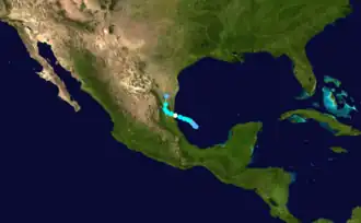 In early September, a trough of low-pressure persisted in the southwestern Gulf of Mexico, near the Bay of Campeche.[1] The area of disturbed weather gradually organized, and was analyzed to have become a tropical depression by 1200 UTC on September 4. In its initial stages after tropical cyclogenesis, the disturbance moved very slowly and did not intensify.[2] Its lack of organization resulted in its estimated misplacement inland over Mexico in the Signal Corps's weather map for September 5.[3][4] At the time, the storm was estimated to have a minimum barometric pressure of at least 1010 mbar (hPa; 29.83 inHg).[3] The system remained a tropical depression until 0000 UTC on September 6, when it was estimated to have attained tropical storm intensity.[1] Despite the analyzed intensification, the updated Signal Corps weather maps for the tropical cyclone that day indicated that the system had degenerated back into an open trough.[1][5] Continuing to intensify throughout the day, the tropical storm was estimated to have reached hurricane intensity by the following day.[2]