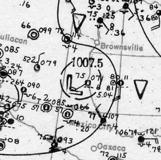 Shortly after, the hurricane made landfall south of Tampico, Mexico near La Leja at 0300 UTC on September 7.[6][7][1] At the time, the cyclone had maximum sustained winds of 80 mph (130 km/h), making it a Category 1 on the modern-day Saffir–Simpson hurricane wind scale. The storm's minimum barometric pressure at landfall was 985 mbar (hPa; 29.10 inHg); this would be the lowest pressure estimated in association with the storm, though it was not included in HURDAT. Just prior to landfall at 0100 UTC, a ship had reported winds of 80 mph (130 km/h) from the southeast and a pressure of 996 mbar (hPa; 29.42 inHg). Upon landfall, a barometer in Tampico reported a minimum pressure of 1003 mbar (hPa; 29.62 inHg).[1] The Signal Corps map of the cyclone for September 7 indicated a pressure of at least 1007.5 mbar (hPa; 29.75 inHg) for the storm's outermost closed isobar, with a storm of similar nature positioned a short distance west of Jalisco, Mexico in the eastern Pacific Ocean.[8] Once inland, the hurricane weakened, and made a northward curve before degenerating into a remnant low after 0600 UTC on September 8.[2] The remnant low progressed northward, and moved into Texas from the state border with Mexico near Webb County. In Texas, moisture associated with the system and other contributing forces produced excessive rainfall over Central Texas, causing numerous rivers to overflow.[7]