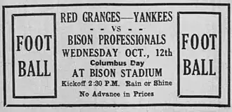 - ^ a b c "Pro Football Teams Ready: Red Grange's Yankees and Benny Friedman's Bulldogs at Dinan Field Today," Detroit Free Press, Oct. 9, 1927, p. 22.