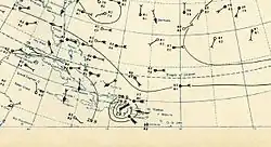 Minor effects were reported away from the coast; the mountainous terrain of Hispaniola greatly weakened the hurricane, which prevented significant amounts of further deaths or damage.[2] Effects in the mountainous areas included downed trees and crop damage.[10] In Haiti, the hurricane produced locally gusty winds and heavy amounts of rainfall, though exact damage details for the nation are unknown.[8] Despite crossing the island of Cuba, no damage or deaths were reported there. Upon moving through the U.S. state of Florida, the storm remained severely weakened; during its passage a pressure of 1,006 mbar (29.7 inHg) was reported in Tampa, the lowest pressure in the state. The threat of the hurricane prompted the National Weather Bureau to issue storm warnings from Southport, North Carolina through the Virginia Capes. The strongest winds remained offshore, with minor damage reported along the Outer Banks. On Cape Lookout, the hurricane downed 12 small-frame buildings and damaged the city's Coast Guard headquarters. Power outages were also reported, leaving some areas on the Outer Banks isolated from communication to the outside world.[10]