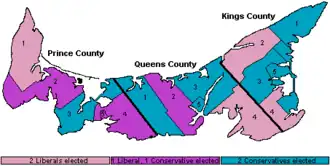 ![]() Map of PEI's ridings coloured in based on how they voted | |||||||||||||||||||||||||||||||||||||