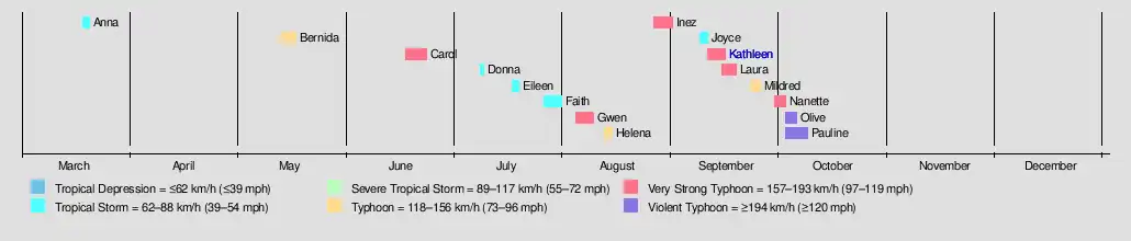 Typhoon Kathleen struck the Boso Peninsula and the entire Kanto Region in Japan on September 15. Heavy rains caused the Arakawa and Tone Rivers to overflow. The resulting floods killed 1,077 people and left 853 people missing.[7]