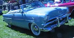 1953 was Ford's 50th anniversary.[3] The big news for 1953 was the availability of power-assisted brakes and steering, which had previously been limited to the Mercury and Lincoln lines. The center grill bullet lost its ring and was now flanked by vertical black stripes, while the corner markers were plain rectangular lights rather than the circular "intakes". All 1953 Fords featured commemorative steering wheels marking the company's 50th anniversary. Mechanical changes included two-inch wider tread, and a k-bar frame with five cross-members.[6] William Clay Ford paced the Indianapolis 500 in a Sunliner convertible with a dummy Continental tire kit (Coronado kit).[3] This was also the last year for real wood trim on the Country Squire wagon. Toward the end of the year, Ford added "Master-Guide" power steering as an option on cars with V8s. Full instrumentation was still used.[7] An unusual service provided by Ford was that the radio preset buttons would already be set to local stations by the dealer.[8] The heater was $74.[9][3]