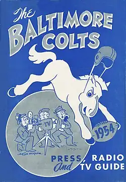 The 1954Baltimore Colts season was the second season for the team in the National Football League. The Baltimore Colts finished the National Football League's 1954 season with a record of 3 wins and 9 losses and finished sixth in the Western Conference. This was the first season that the Horseshoes appeared on the helmet. For the first two seasons (1954 & 55), the horseshoes were white and they were located on the back of an all blue helmet. In 1956 the color of the helmet change to White while the Horseshoes became blue. It wasn't until 1957 when the Colts received their most famous helmet design that's still in use to this day, a white helmet with a blue stripe down the middle and a blue horseshoe on either side.