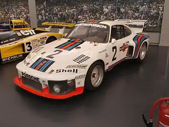 The Porsche works team returned with two new designs for the new regulations. Norbert Singer had led the development of the Group 5 Porsche 935 from the 934 Turbo of 1974. The 2.85-litre flat-6 engine was augmented by a KKK (Kühnle, Kopp & Kausch) turbo, producing 590 bhp and capable of 335 kp/h (210 mph). The chassis only weighed 900 kg, well under the 970 kg minimum stipulated for a 4-litre car in the rules, allowing the compulsory ballast to then improve weight distribution. Regulations also permitted the lights to be recessed into the front spoiler further improving aerodynamics. For Le Mans, the works car was driven by Rolf Stommelen/Manfred Schurti.[12]